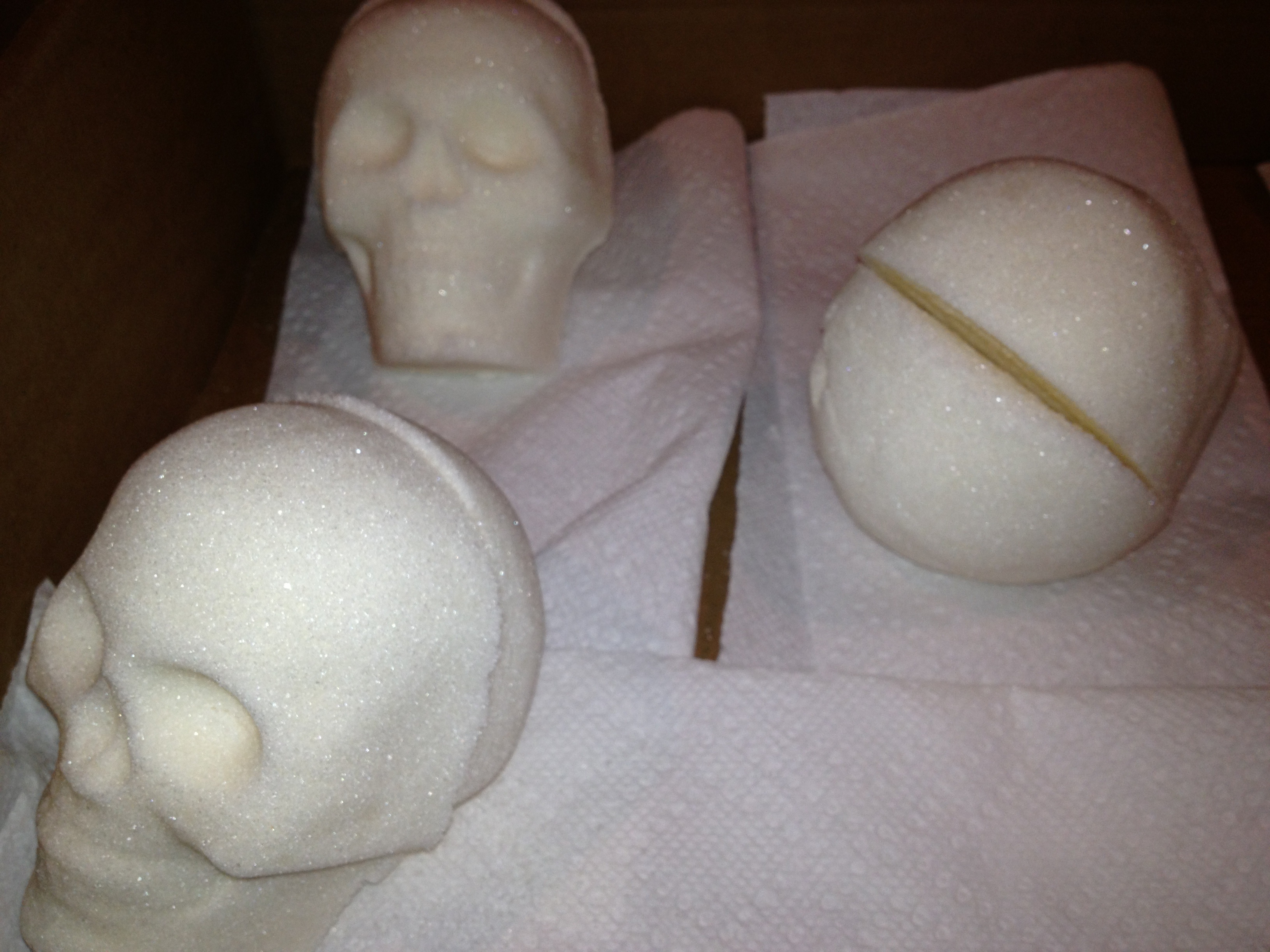1. My molds are made of two pieces, a face and the back of the skull. With the plain white Royal Frosting, add a small amount to each half and place together, wiping away any excess that comes out of the seams.