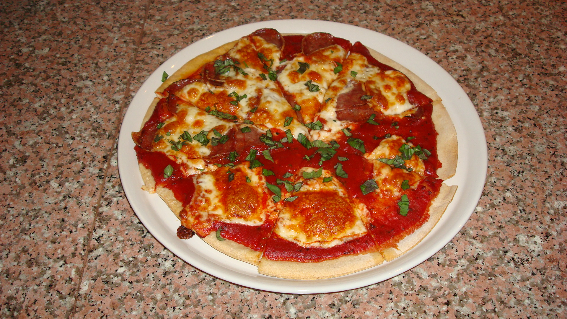 Similar to the eggplant caponata of the previous post, there’s always a Middle Eastern snag. Here in Jordan (as you might have guessed) pork products are nearly impossible to find (and I’ve scoured three grocery stores thus far).  What we’re left with is  “beef” pepperoni and it’s not pretty. In fact, it reminds me of bologna. Yum.
