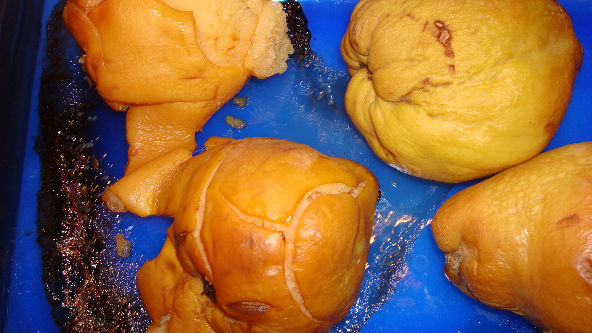 3. When quinces are cool enough to handle, with a sharp knife peel, quarter, and core them.