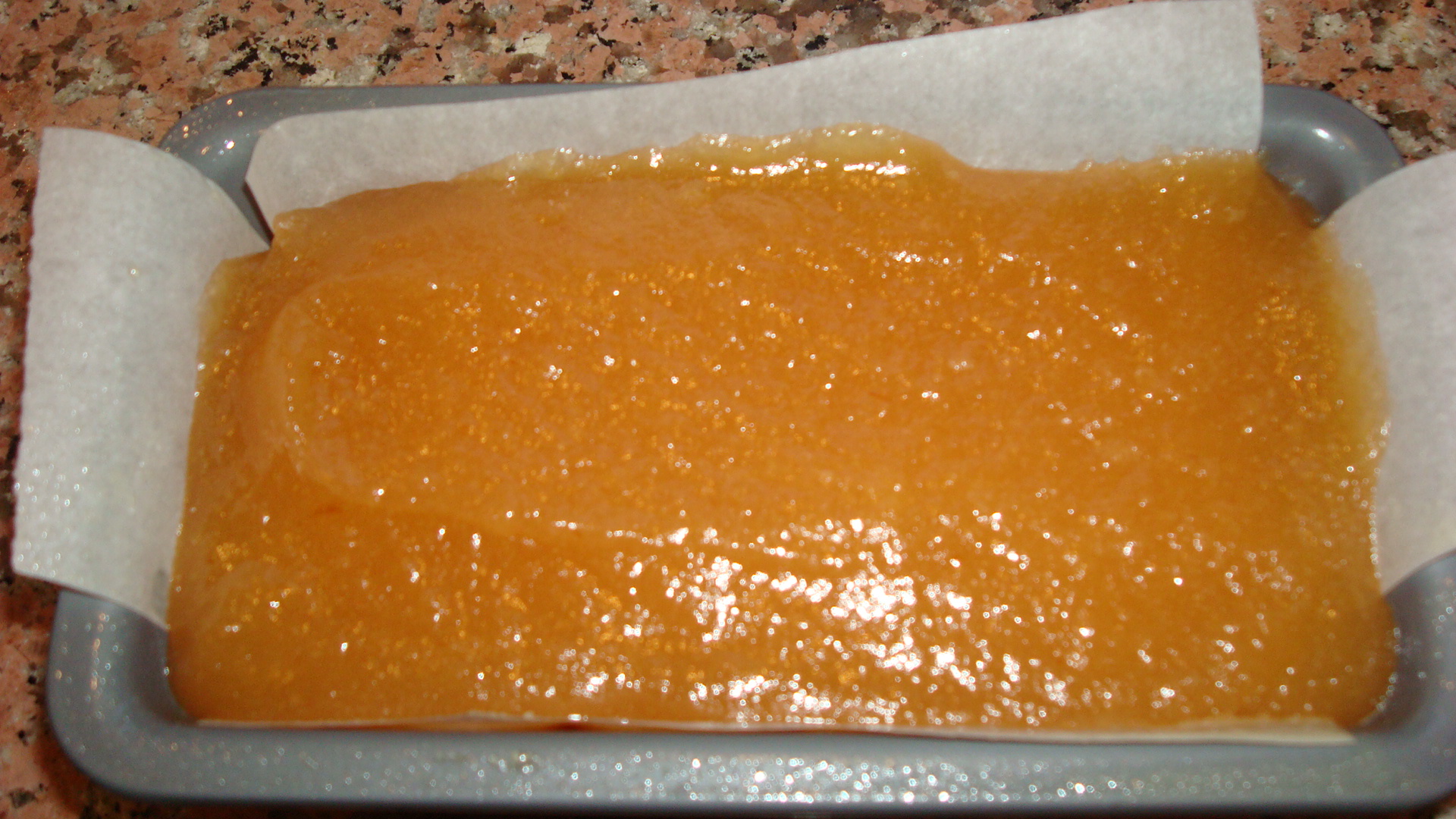 7. Pour puree into terrine, smoothing top with an offset spatula. Place in the oven for 1 hour and 30 minutes to further dry the quince paste. Cool and chill puree, loosely covered with plastic wrap, until set, about 4 hours.
