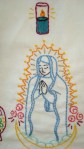 The patterns for Day of the DeadMy very first stitches…so nervousVoila…Onto project numero dosCloseup of Our Lady of SomethingThe cutest sugar skulls I’ve ever seenProject number three from a world travelerI want those gold shoes