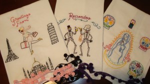 I happened upon Sublime Stitching’s website months ago while I was trolling the Internet aimlessly (as I did all day long in Amman). I fell in love with her whimsical and charming patterns and ordered a few last month as a prize for myself. I started with a kit, which included a hoop, floss, scissors, a tea towel, and needles, and also ordered a couple of additional patterns: Dia de Los Muertos and Bon Voyage, plus a couple more towels.