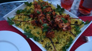 Moroccan Chicken Skewers with Couscous with Currents, Barberries (if I could find them), Mint, and Parsley