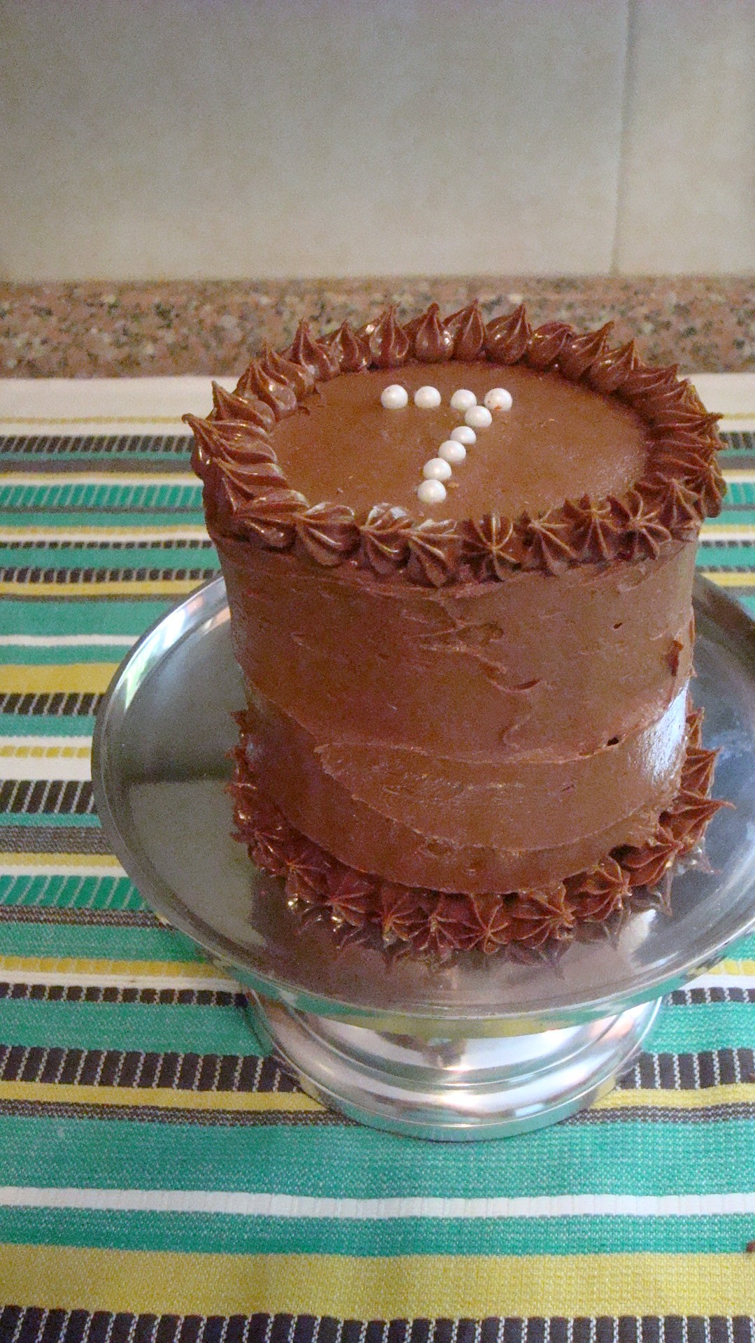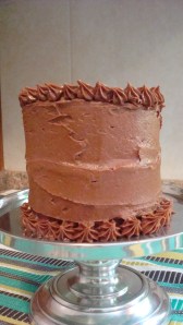Preheat oven to 350 degrees. Lightly grease two 8-inch cake pans and set aside (I used 4×2 cake pans and it made 4 little cakes. I froze two for a later date). In a small saucepan, mix together the cold water and cocoa powder. Heat over medium, stirring constantly, until the mixture starts to boil. Remove from heat and set aside to cool. The mix should be paste-like. In a large mixing bowl, cream together the sugars and butter. Add the eggs, salt and vanilla extract and mix well. Add the cocoa mixture and beat well. In a small bowl, mix together the sour cream, milk and baking soda. Gradually add the sour cream mix to the batter, alternating with the flour. Beat well after each addition. Pour into pans and bake at 350 degrees for 22-26 minutes. Use a toothpick to test or note that the cake is fully risen and pulling away from the sides of the pan. Remove from the oven and let cool for a few minutes. Remove from the pans and let cool thoroughly before icing.