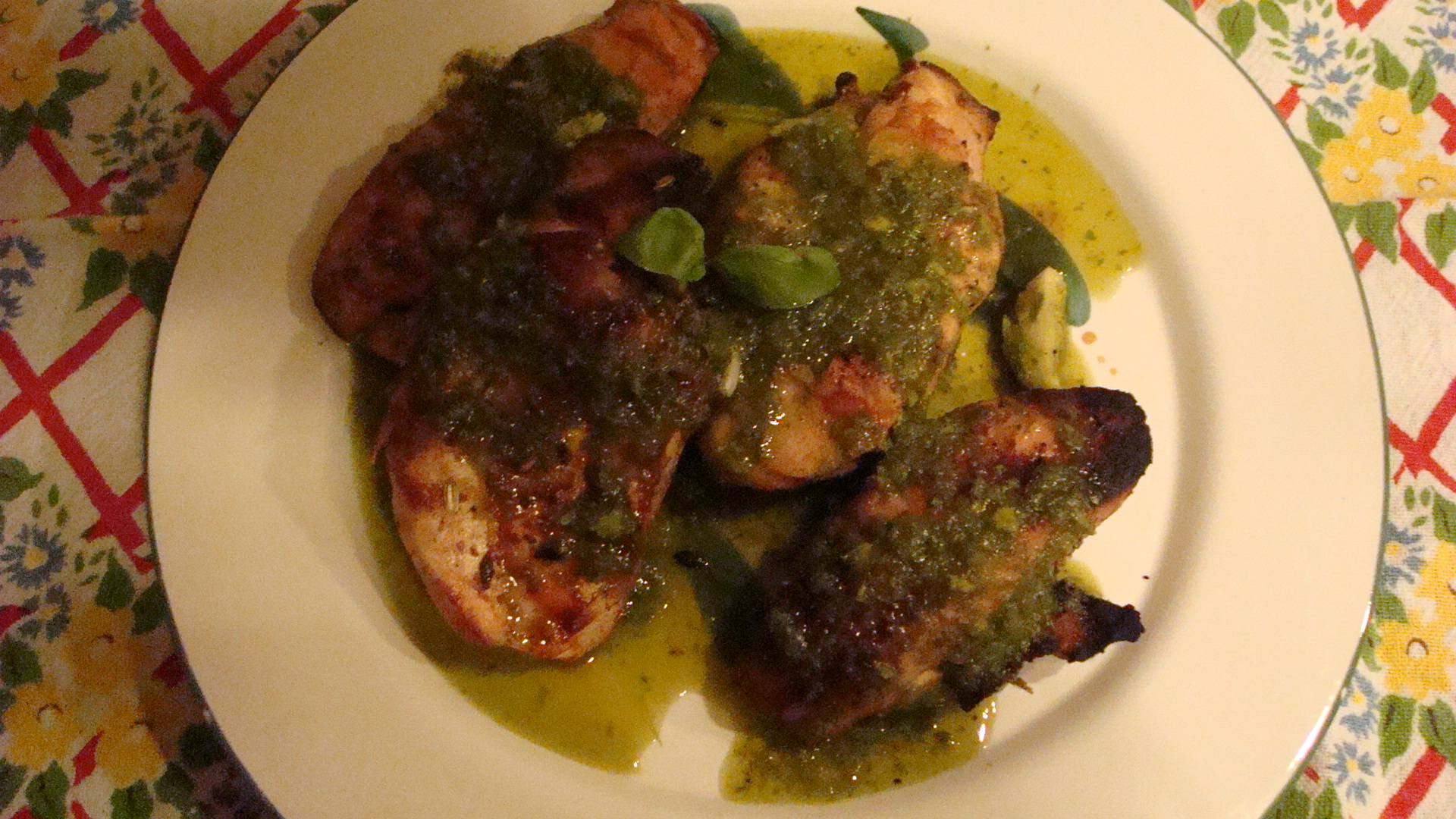 I love this recipe from Blue Eggs and Yellow Tomatoes because it’s quick (with some advance planning), doesn’t require the use of my propane oven (it’s grilled) and it’s always good.